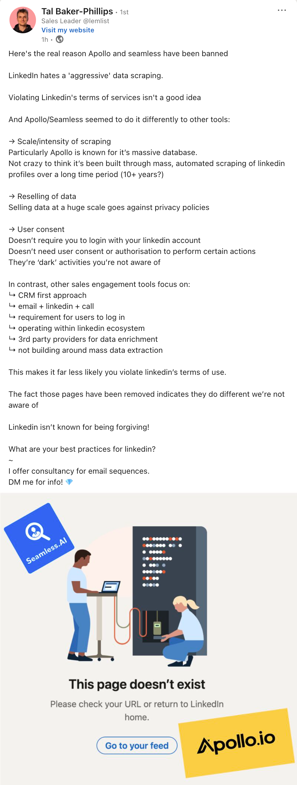 This morning, LinkedIn sent shockwaves through the B2B sales and marketing world by banning Apollo.io's LinkedIn page (along others including Prospeo and Seamless.ai) in a sign that the social network is cracking down on breaches of its terms of service.