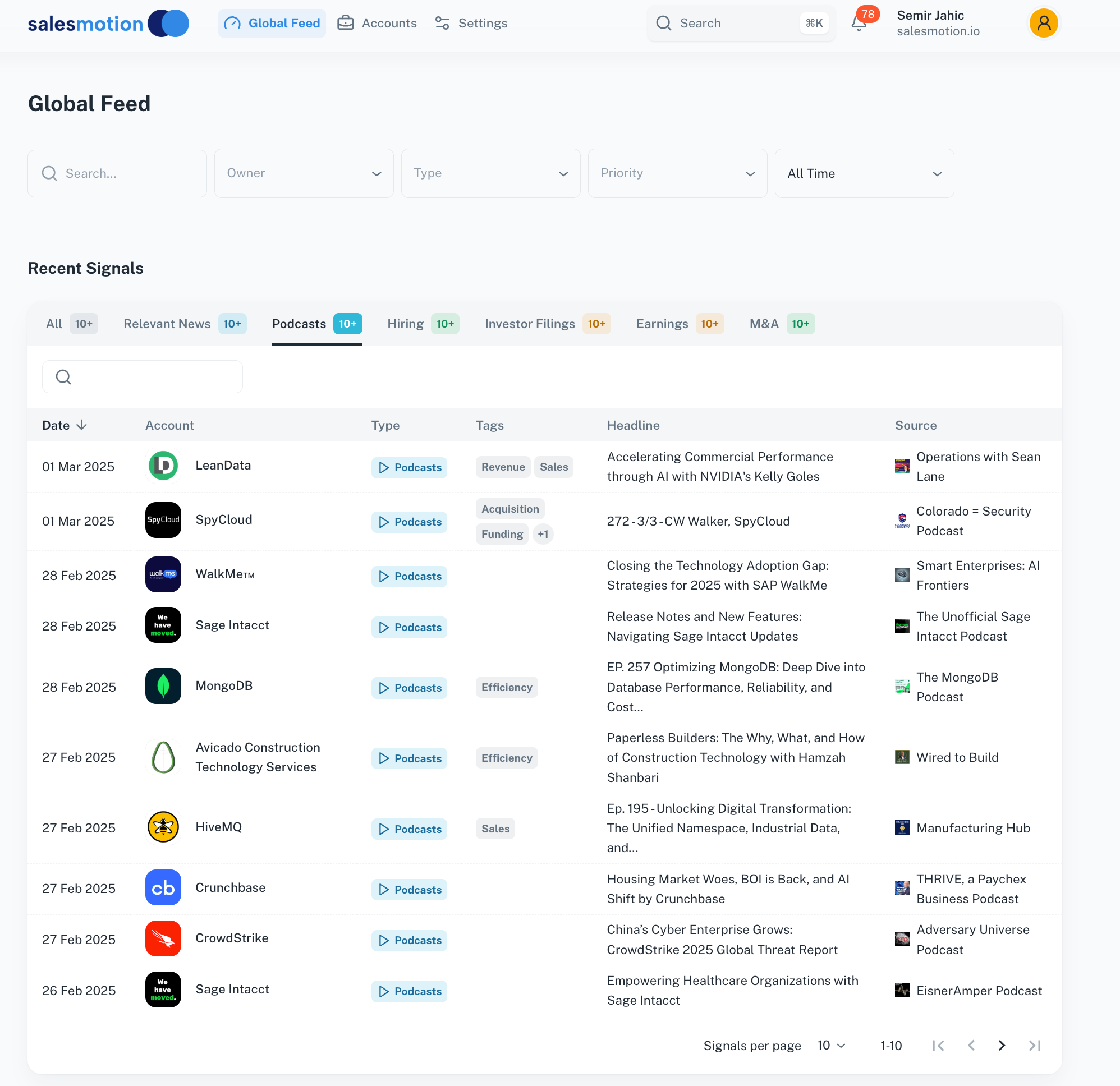 Salesmotion is an advanced account intelligence platform that analyzes 1000s of public signals including SEC filings (10-Ks, 10-Qs, DEF 14A), earnings calls, news articles, job postings, podcasts, and more to deliver timely, actionable insights into target accounts.