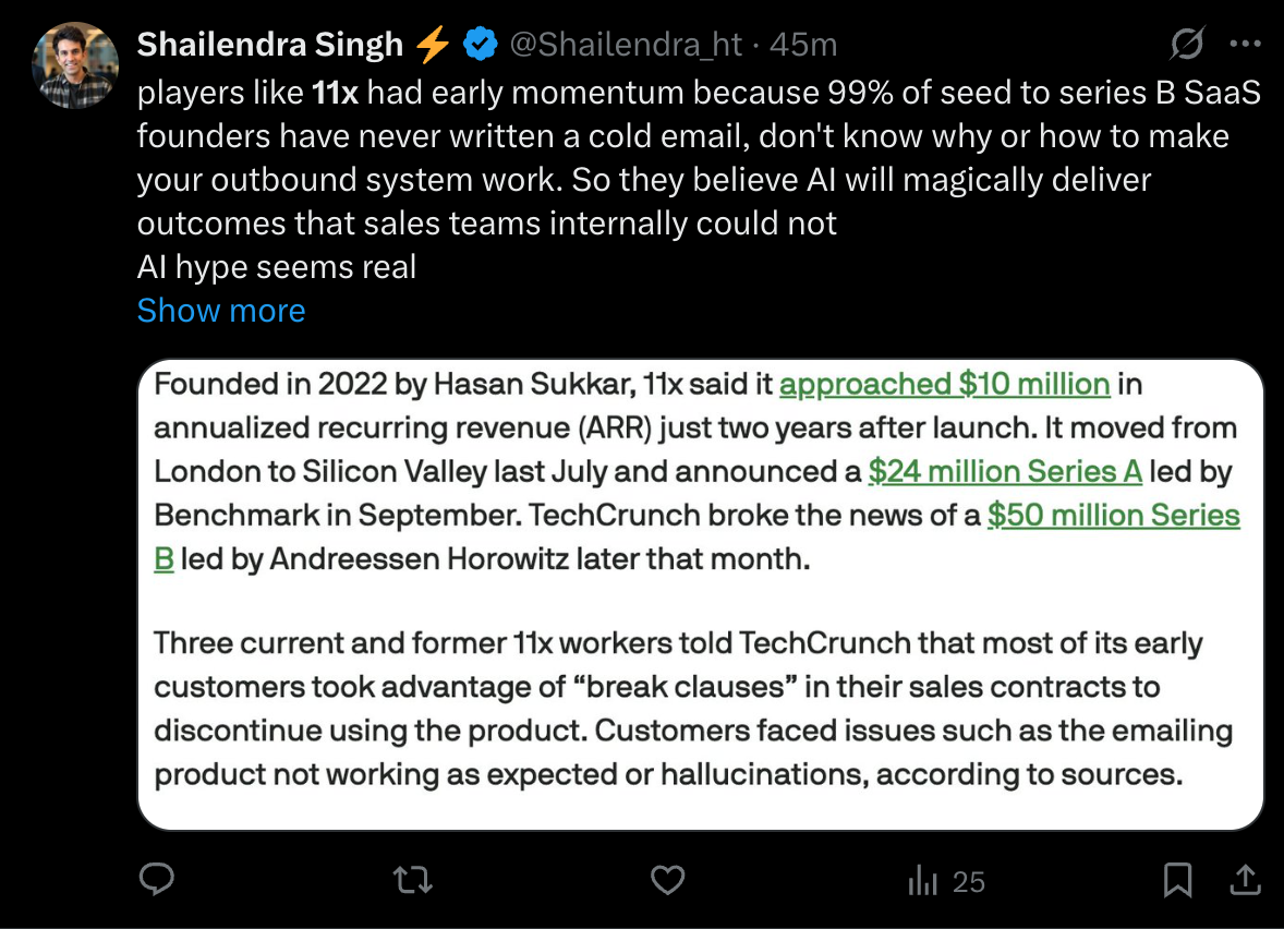 Shailendra Singh offers an insightful take: "players like 11x had early momentum because 99% of seed to series B SaaS founders have never written a cold email, don't know why or how to make your outbound system work. So they believe AI will magically deliver outcomes that sales teams internally could not."