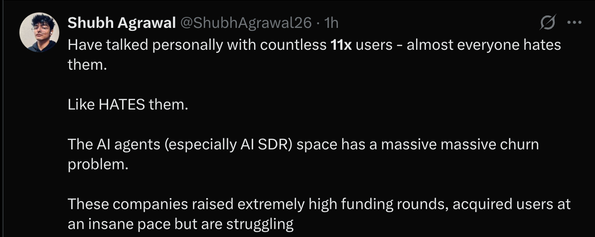"Have talked personally with countless 11x users - almost everyone hates them. Like HATES them." - Shubh Agrawal