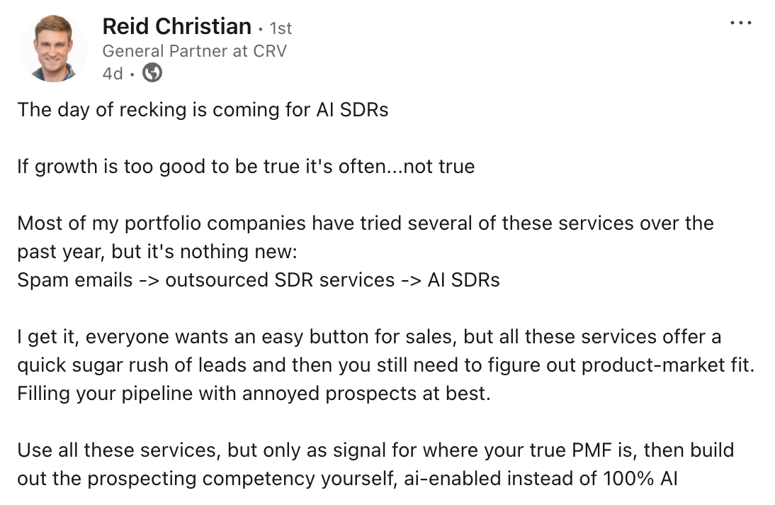 "The day of reckoning is coming for AI SDRs. If growth is too good to be true it's often...not true." Christian notes that most of his portfolio companies have tried these services, but it's nothing new: "Spam emails -> outsourced SDR services -> AI SDRs."