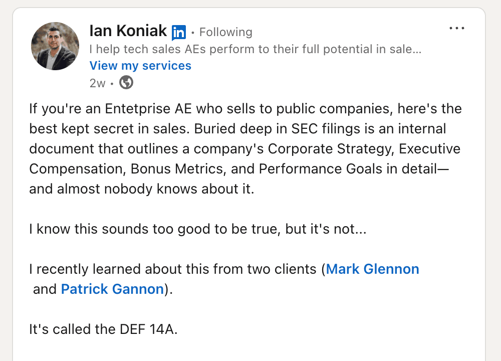 - Sales experts like Ian Koniak have used DEF 14A insights via Salesmotion to close multiple 8-figure deals through highly personalized, insight-driven outreach.