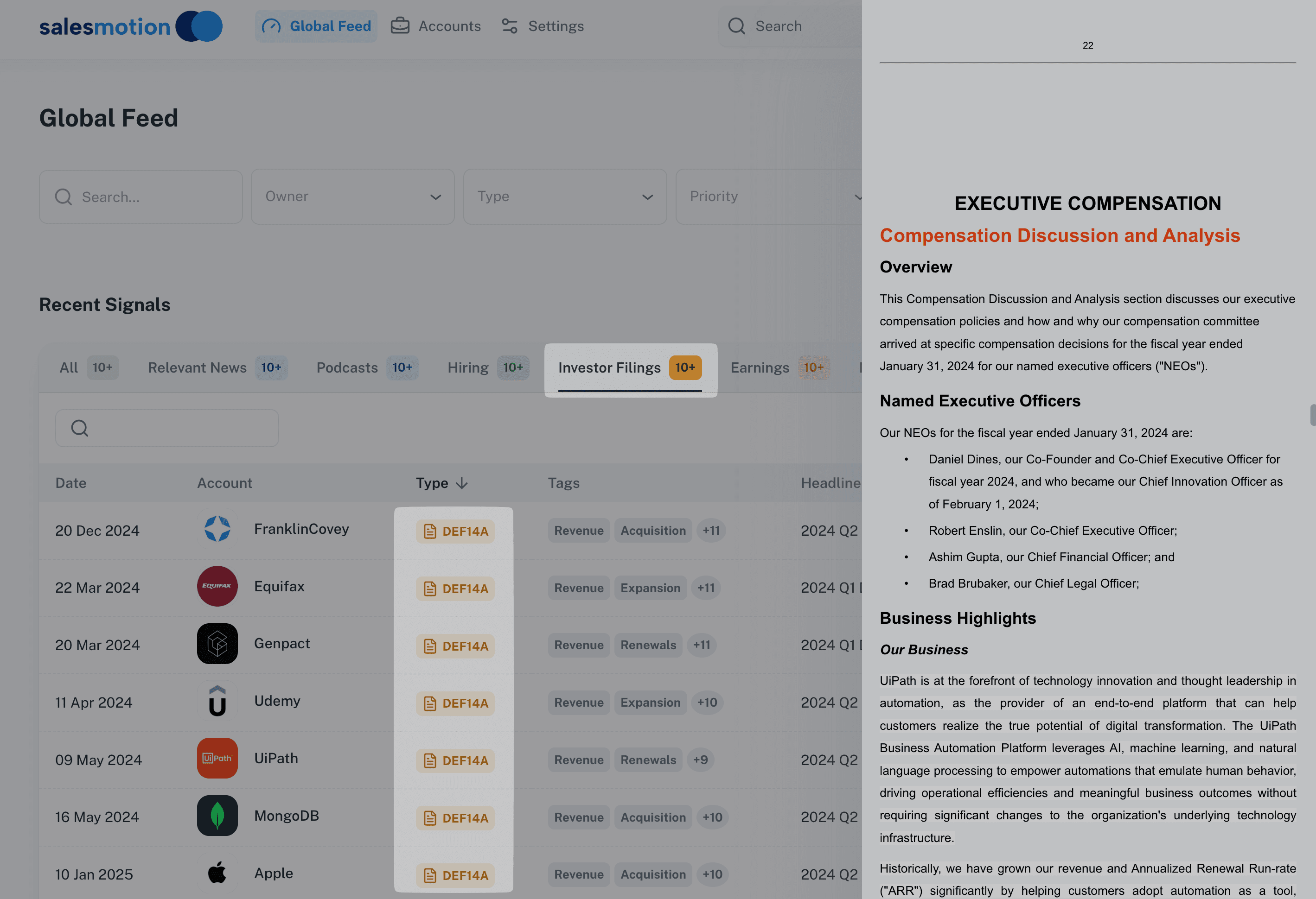 Salesmotion is also taking account intelligence to a new level by integrating DEF 14A Filings into your Signal Feed, alongside existing SEC filings like 10-Ks, 10-Qs, and earnings call data.