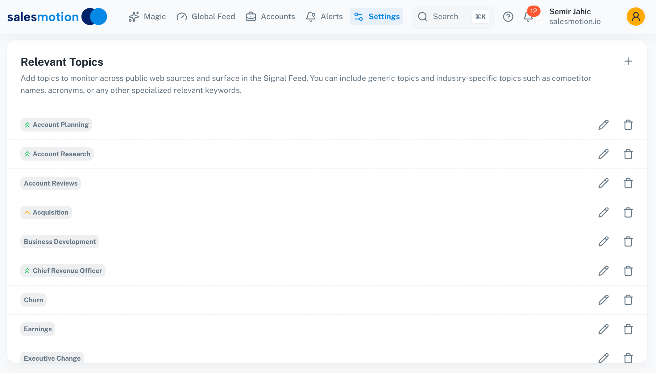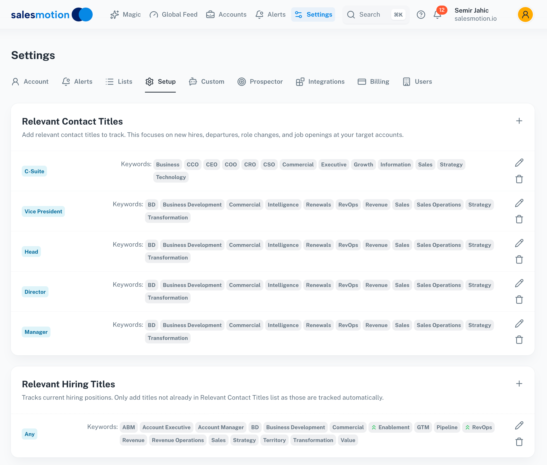 Salesmotion monitors 1,000+ public data sources for every tracked account, but the intelligence it surfaces is only as good as the configuration behind it. The Setup section in Settings is where you tell Salesmotion what matters to your business — which keywords to watch for, which job titles represent your buyers, and which signals to filter out.