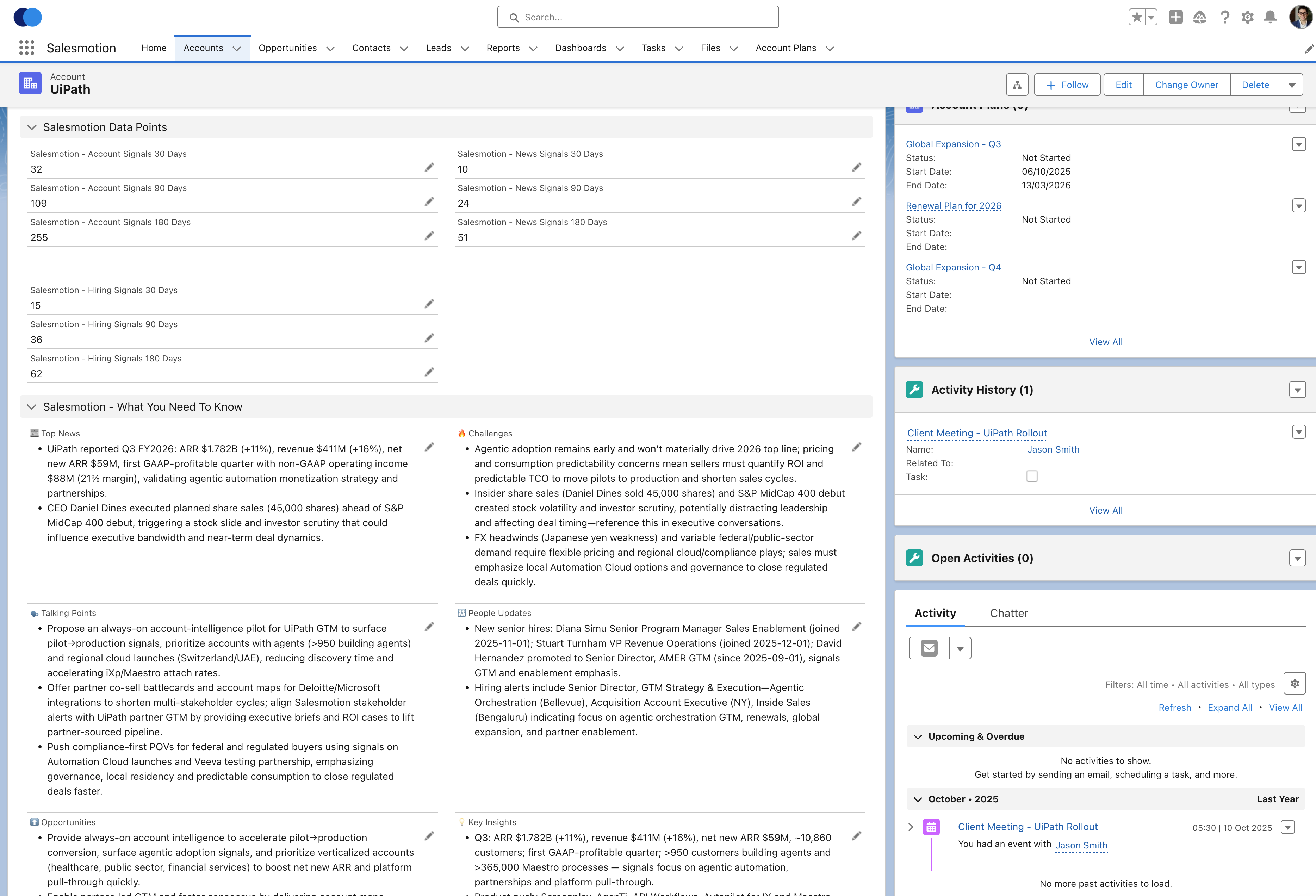 - Signal summaries — Key recent signals displayed as custom fields or related list items on the Account record.