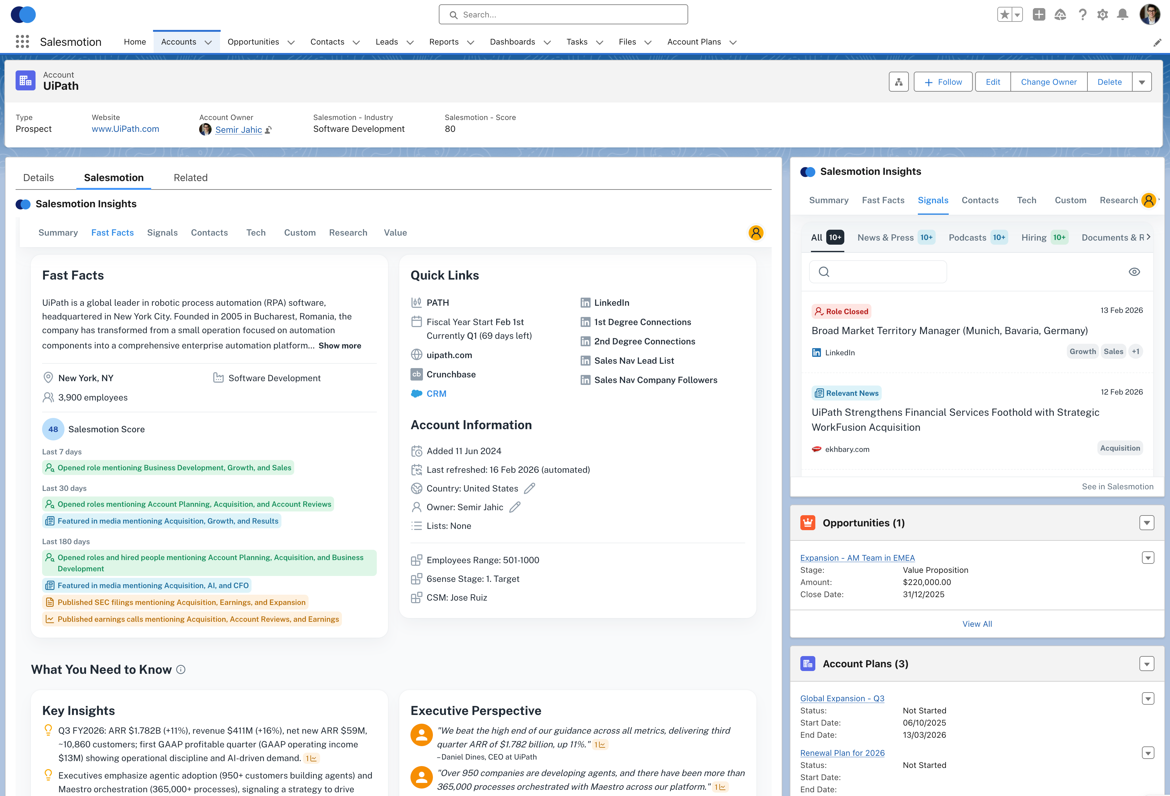 This means reps never need to leave Salesforce to access Salesmotion intelligence. Deep account research is available at the point of work.
