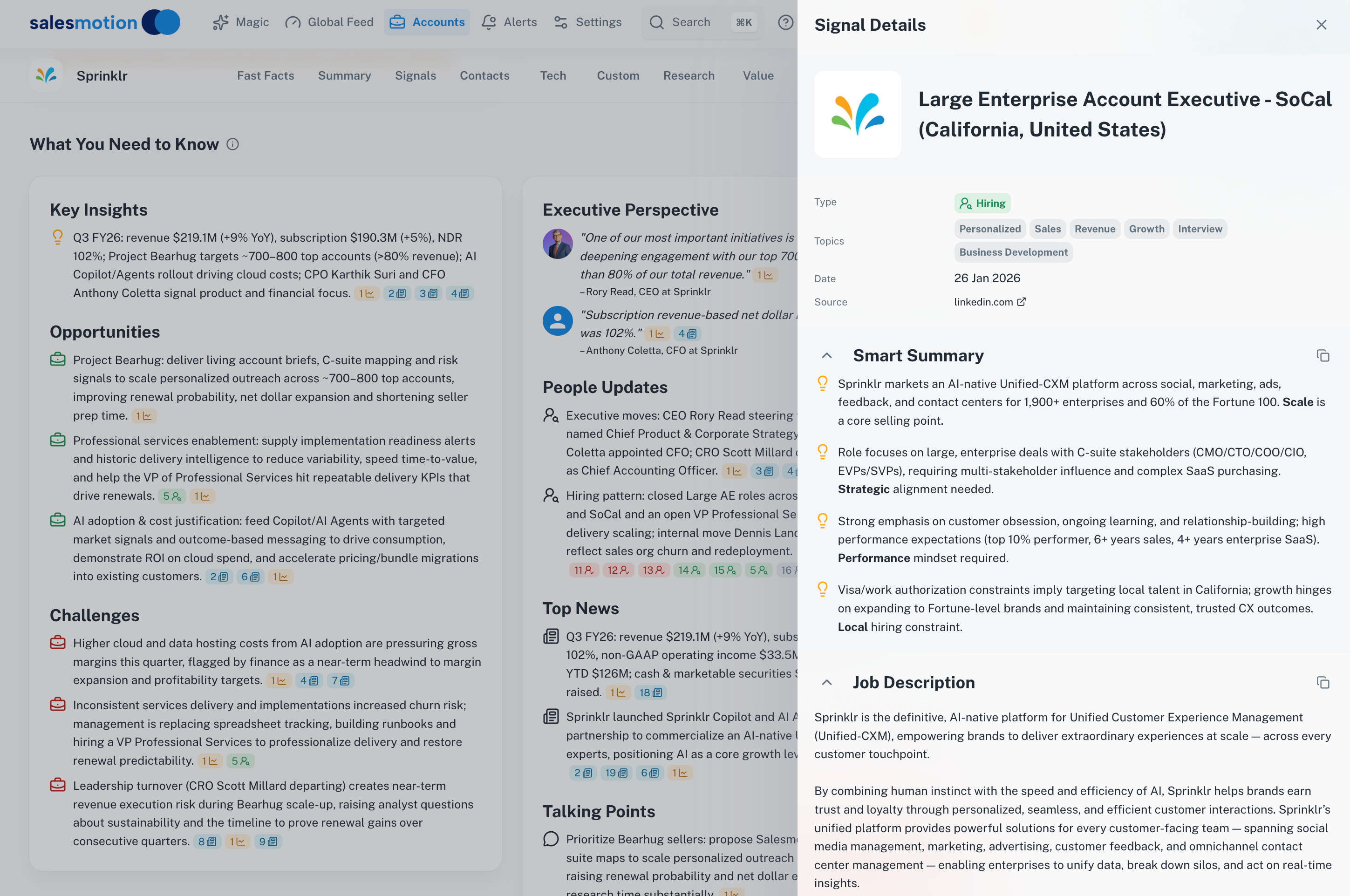 Clicking a hiring-related insight opens the full signal detail, showing the exact job posting or leadership change that the Summary is referencing.