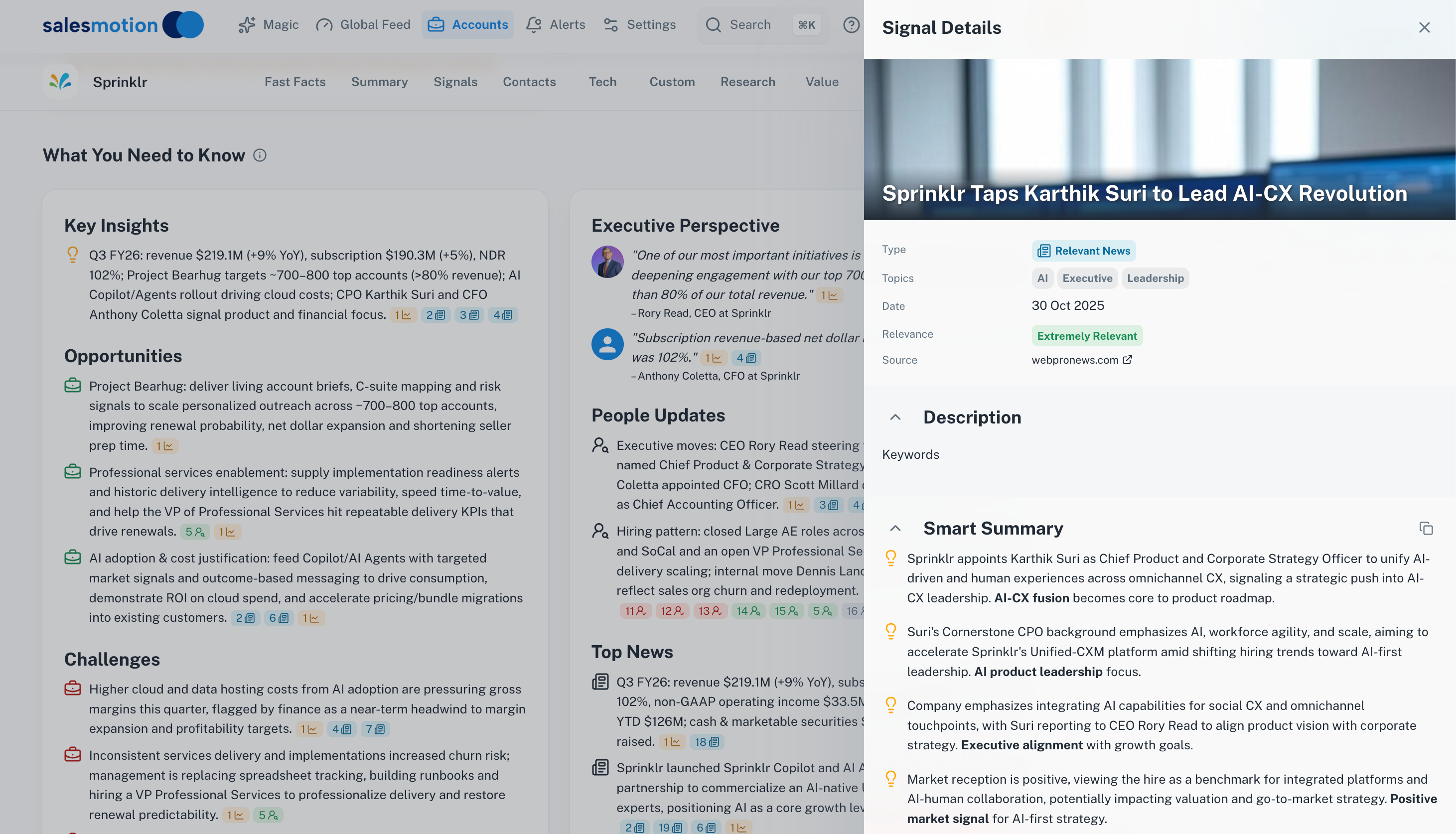 - Click through to signal details. If you plan to reference a specific insight in a meeting, click through to verify the source first. This ensures accuracy and gives you the full context.