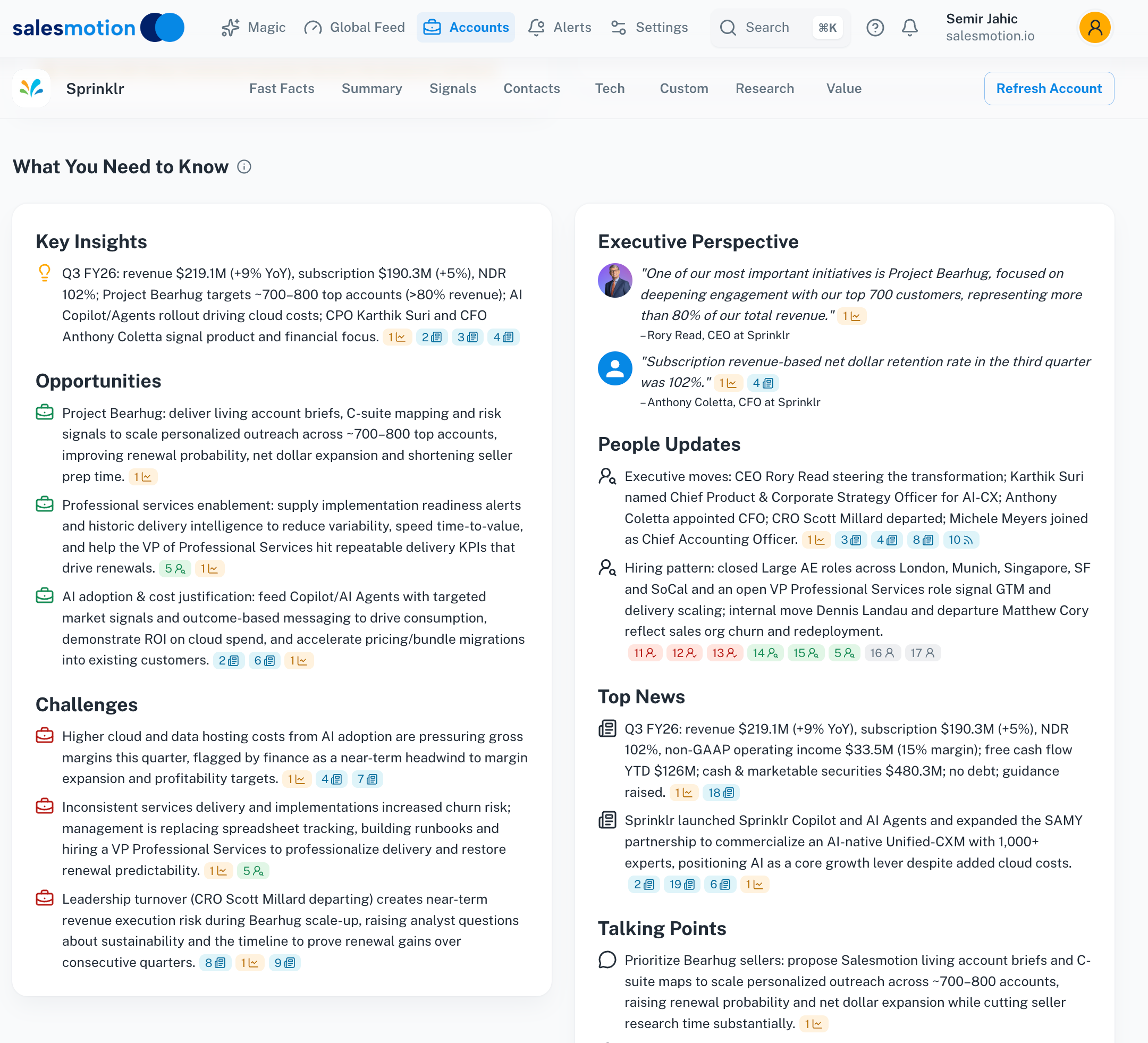 The Opportunities and Challenges sections are invaluable for building account plans. They give you an AI-generated perspective on where your solution fits and what headwinds the account is facing — saving hours of manual research.