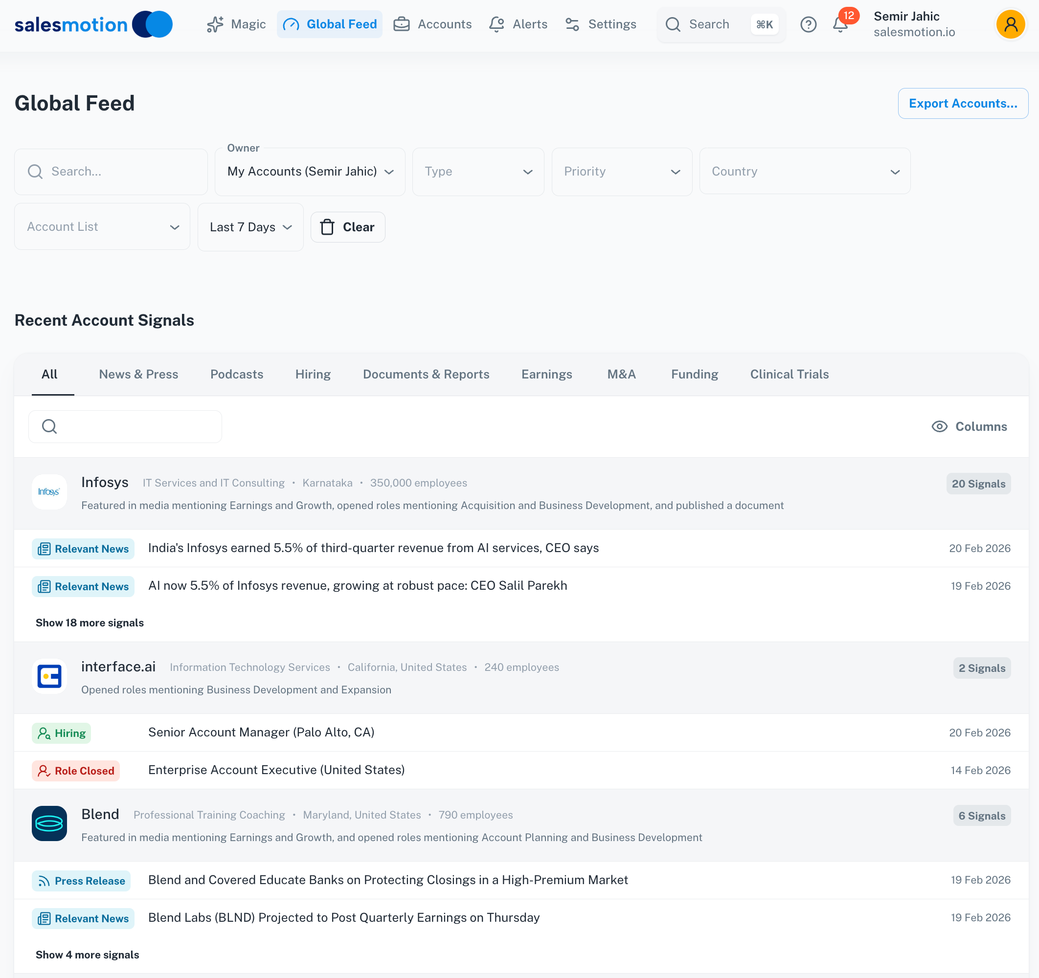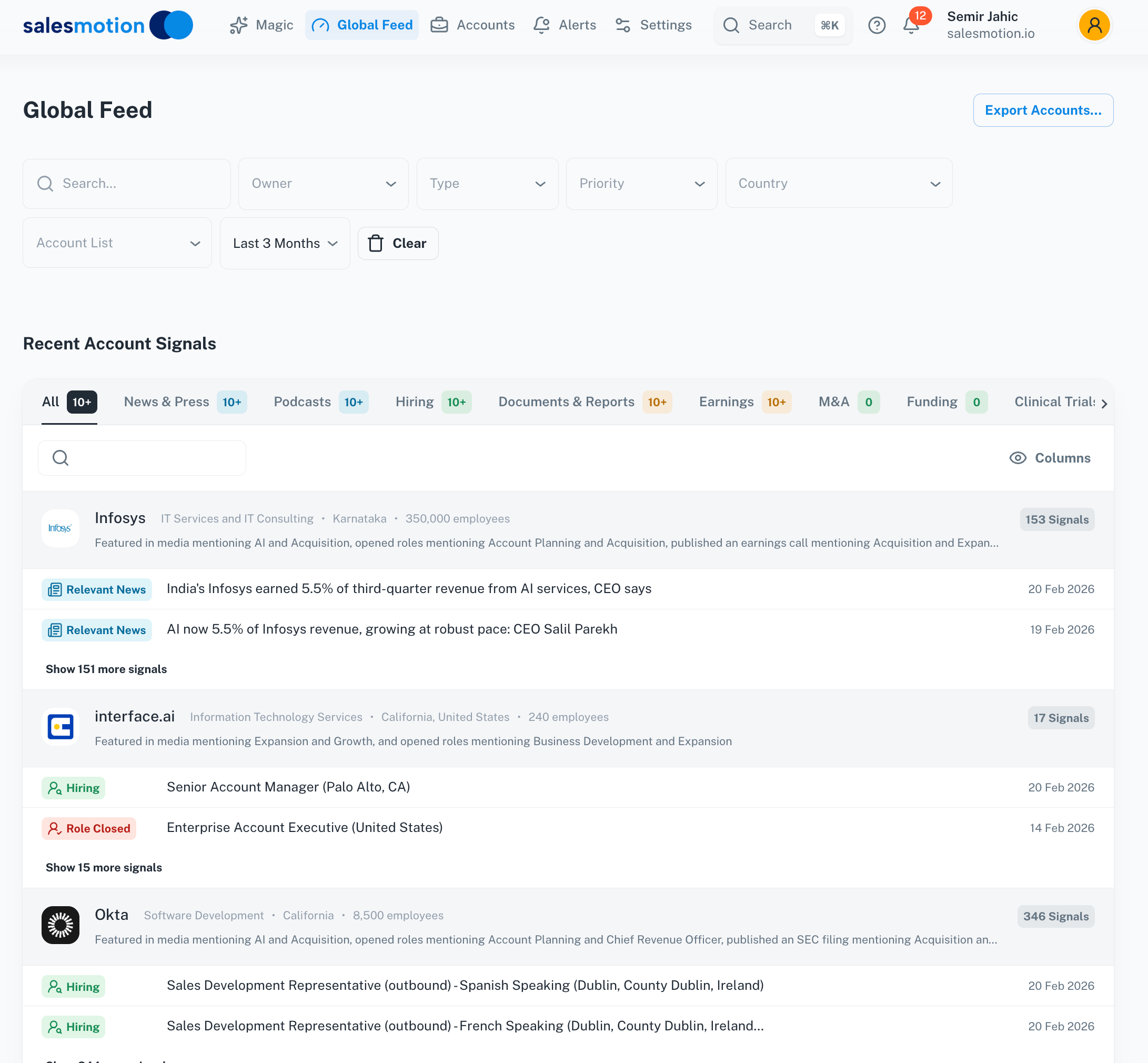 The Global Feed updates continuously as Salesmotion detects new signals from its 1,000+ data sources. When you open the feed, you're always seeing the latest available information.