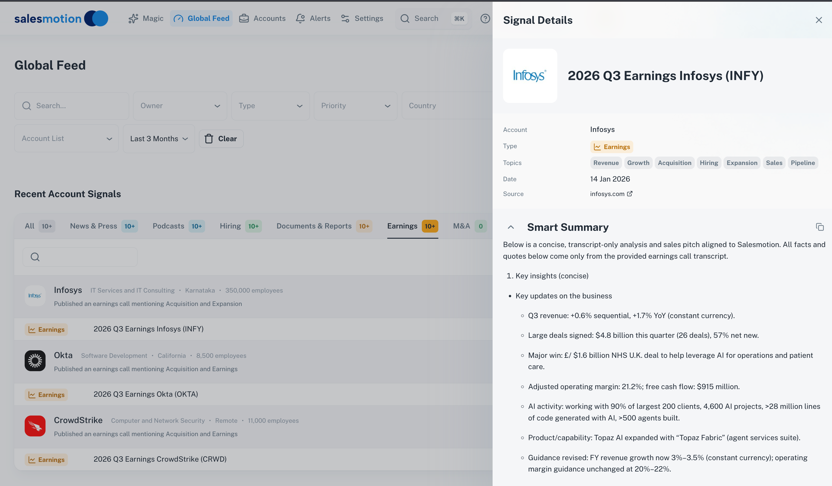 This means a cybersecurity company and a healthcare company using Salesmotion will see completely different intelligence — even if they're tracking some of the same accounts. The feed surfaces precisely what each sales team needs to know, in a single place, without the noise.