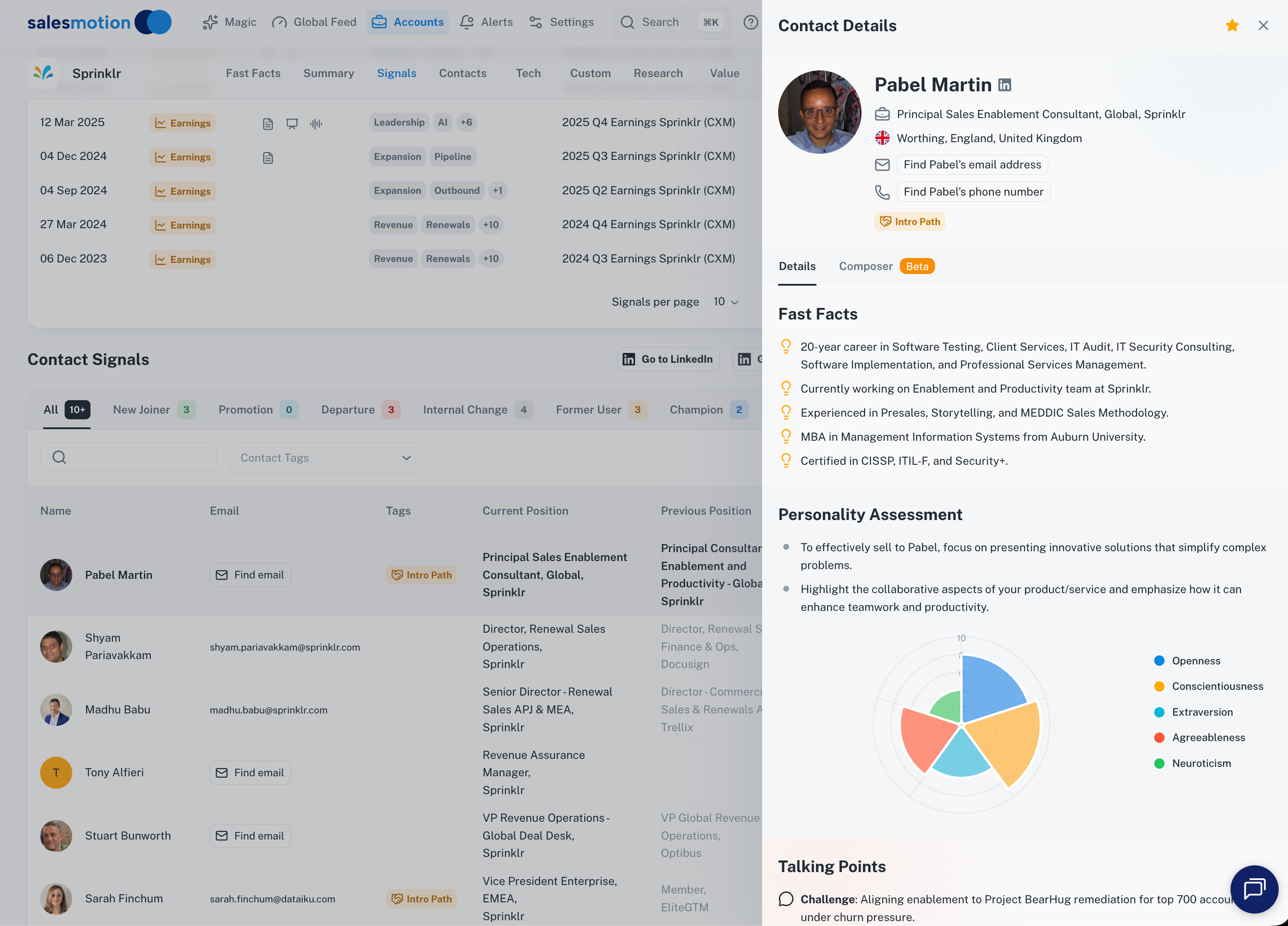 The Contacts tab for Sprinklr — the list on the left shows names, emails, and positions, while the detail drawer on the right shows AI-generated Fast Facts, Personality Assessment, and Talking Points for the selected contact.